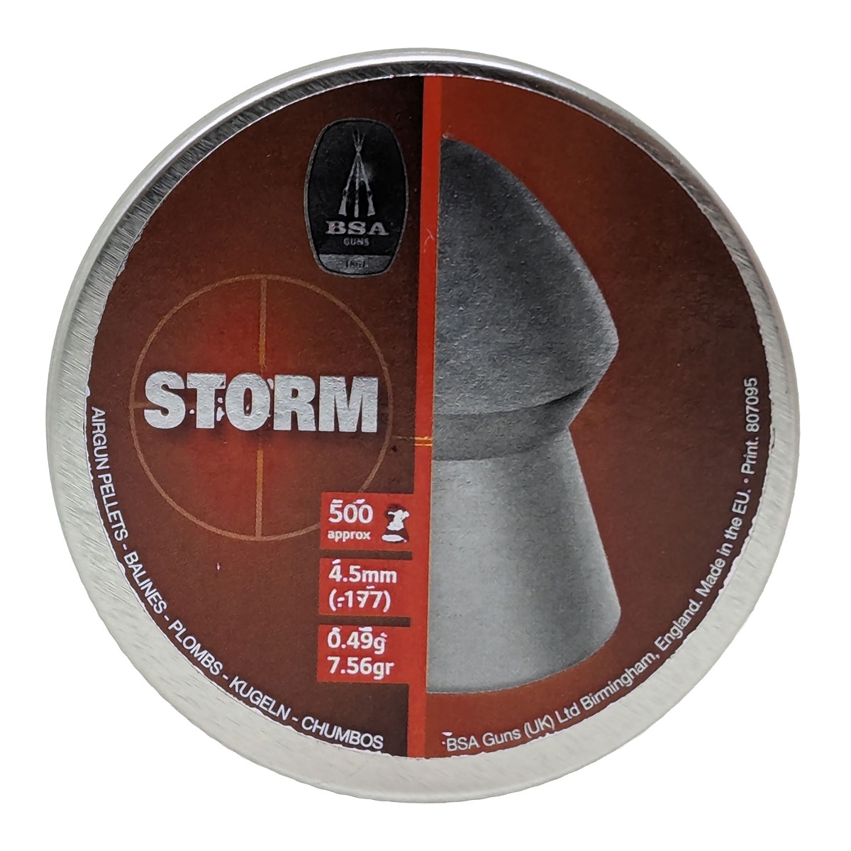 BSA Storm Pointed Pellets. High-crowned domehead. The ultimate pellet for extreme-range performance. This medium weight, highly aerodynamic pellet represents the perfect combination for hunting. Its streamlined profile creates less 'drag' in flight and promotes a more forgiving trajectory, while its weight-forward design maximises the pellet's energy-transfer on impact.