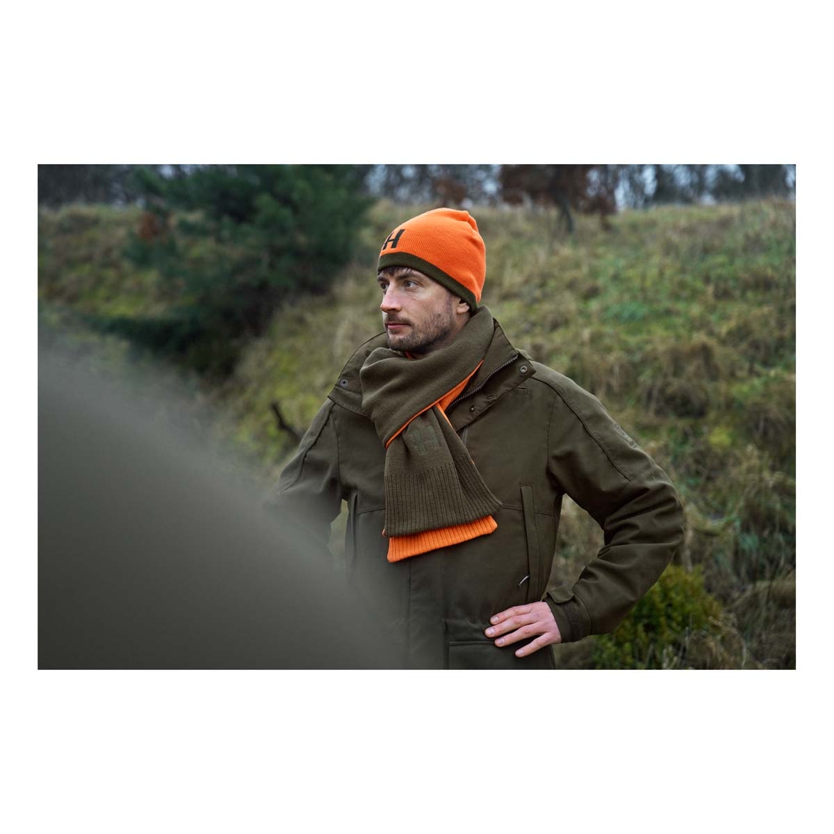 Harkila Reversible Beanie - Willow Green/Orange. Our Reversible Beanie and Scarf set combines style with performance. It’s crafted from a soft, warm blend of 50% merino wool and provides excellent temperature regulation while maintaining a comfortable fit. The reversible design allows you to switch between subtle and visible, making it perfect for any hunting type and occasion. Both pieces feature CleverWool quality for enhanced comfort and are embroidered with our signature logo, ensuring you stay warm and stylish during your adventures.