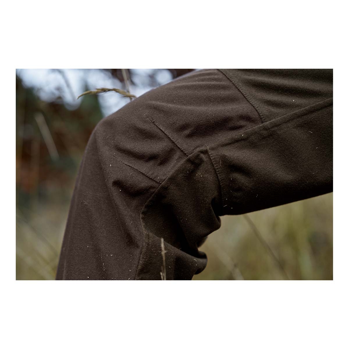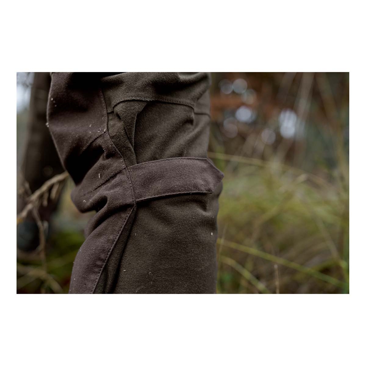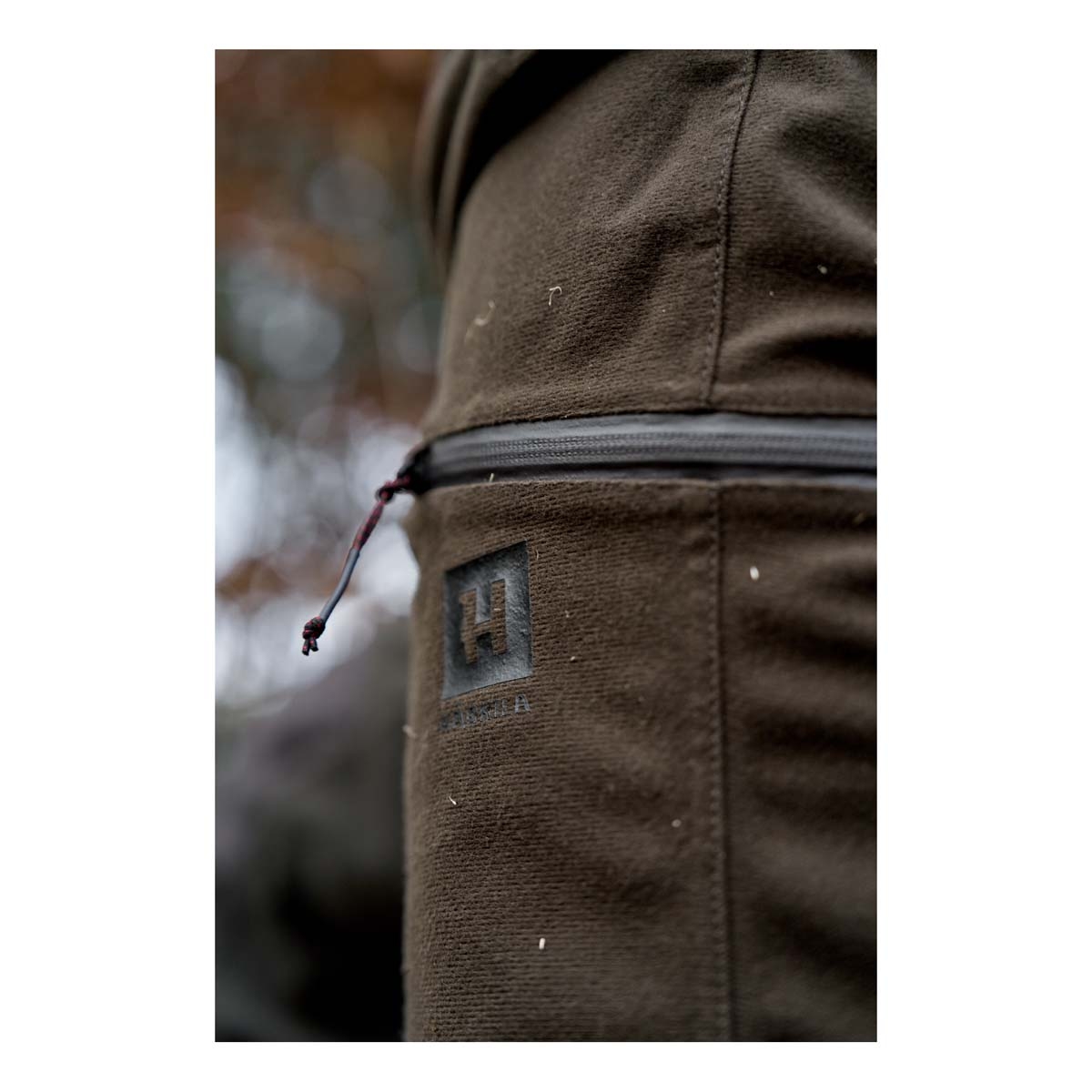 Harkila Aspire HWS Trousers - Hunting Green/Shadow Brown. Our Aspire HWS Trousers combine durability, silence and weather protection. They feature the Härkila Weather System (HWS) membrane, which is fully windproof, waterproof (20,000 mm water column pressure) and highly breathable, keeping you dry and comfortable in unpredictable weather. The trousers are crafted from robust, silent tricot fabric with a Durable Water Repellent (DWR) treatment, making them resist dirt and water while allowing stealthy movement. Inside, a moisture-wicking mesh lining ensures comfort during high-activity hunts. Practical features include top-entry pockets, thigh pockets with waterproof zips and a cartridge holder in the right thigh pocket. With adjustable ankle straps and knee adjustments, these trousers offer a secure fit around boots and enhanced freedom of movement, even in steep terrain.