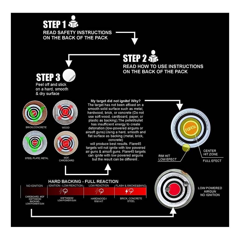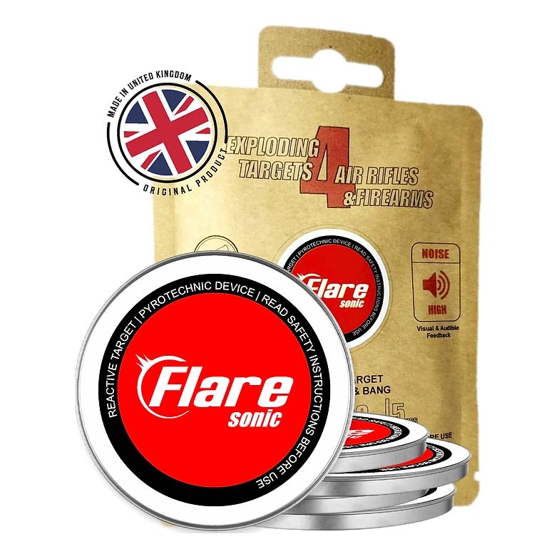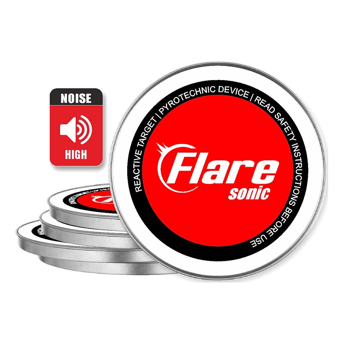 Flare 38mm Sonic Reactive Targets - Loud (5pk). Flare Sonic Targets are small and lightweight, with a 38 mm diameter. Target delivers a satisfying result upon a direct hit of light, smoke, and loud bang. Flare Sonic targets have a self-adhesive backing that makes it easy to stick them on any dry hard surface. Varying results based on the backing material.