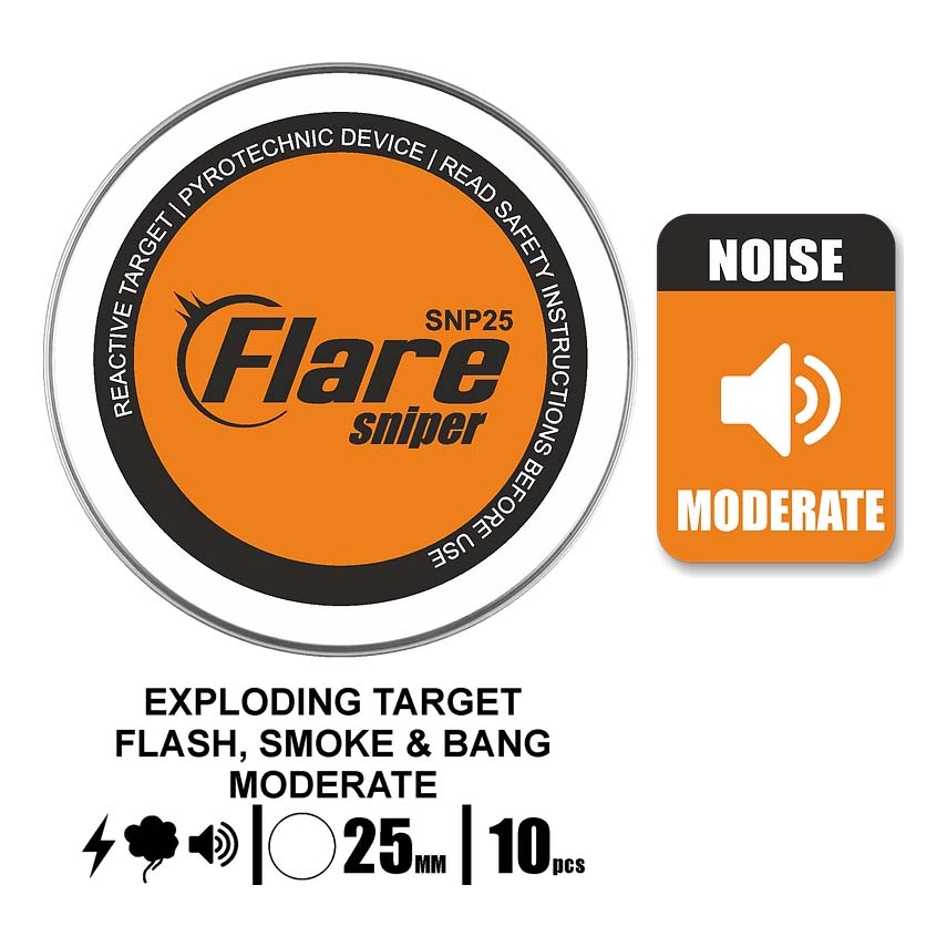 Flare 38mm Sniper Reactive Targets - Moderate (5pk). Flare Sniper Targets are small and lightweight, with a 25 mm diameter. Target delivers a satisfying result upon a direct hit of light, smoke, and loud bang. Flare Sonic targets have a self-adhesive backing that makes it easy to stick them on any dry hard surface. Varying results based on the backing material.