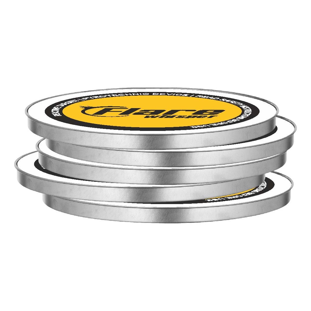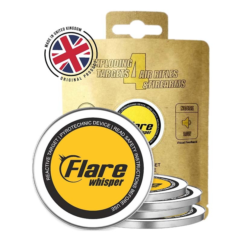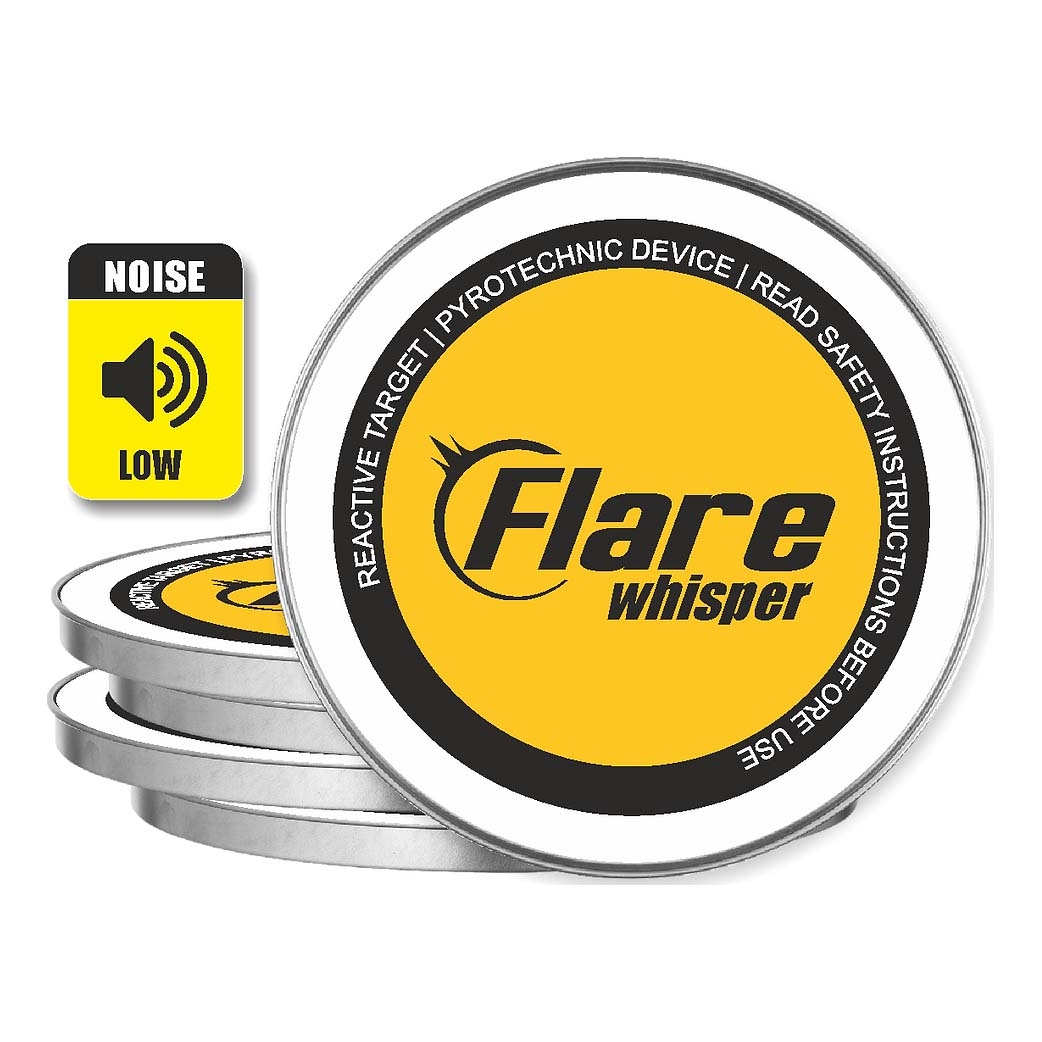 Flare 38mm Whisper Reactive Targets - Quiet (5pk). Flare Whisper Targets are small and lightweight, with a 38 mm diameter. Target delivers a satisfying result upon a direct hit of light and smoke. Flare Whisper targets have a self-adhesive backing that makes it easy to stick them on any dry hard surface. Varying results based on the backing material.