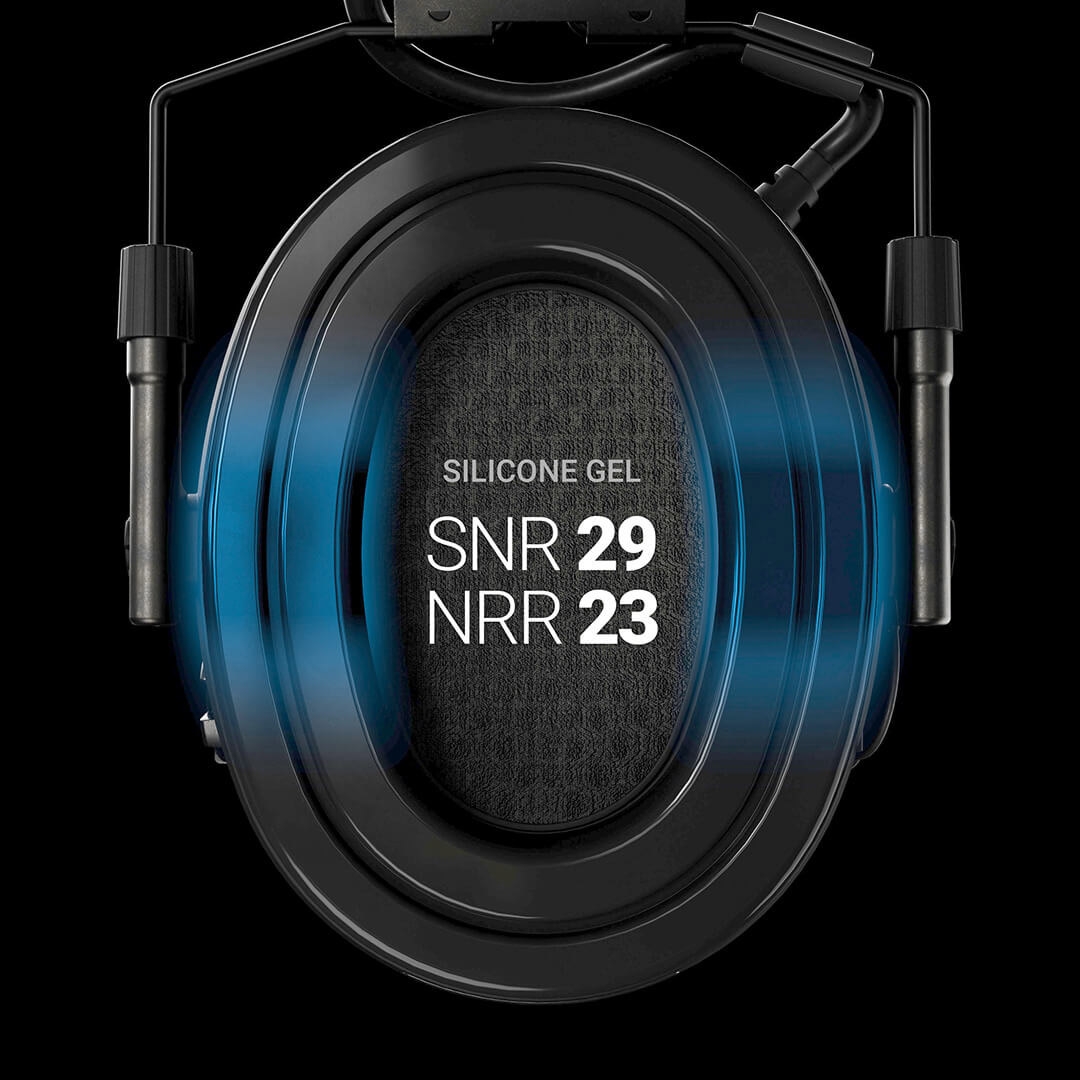 - High attenuation with slim cup design (SNR 29 dB / NRR 23 dB) for safe protection.