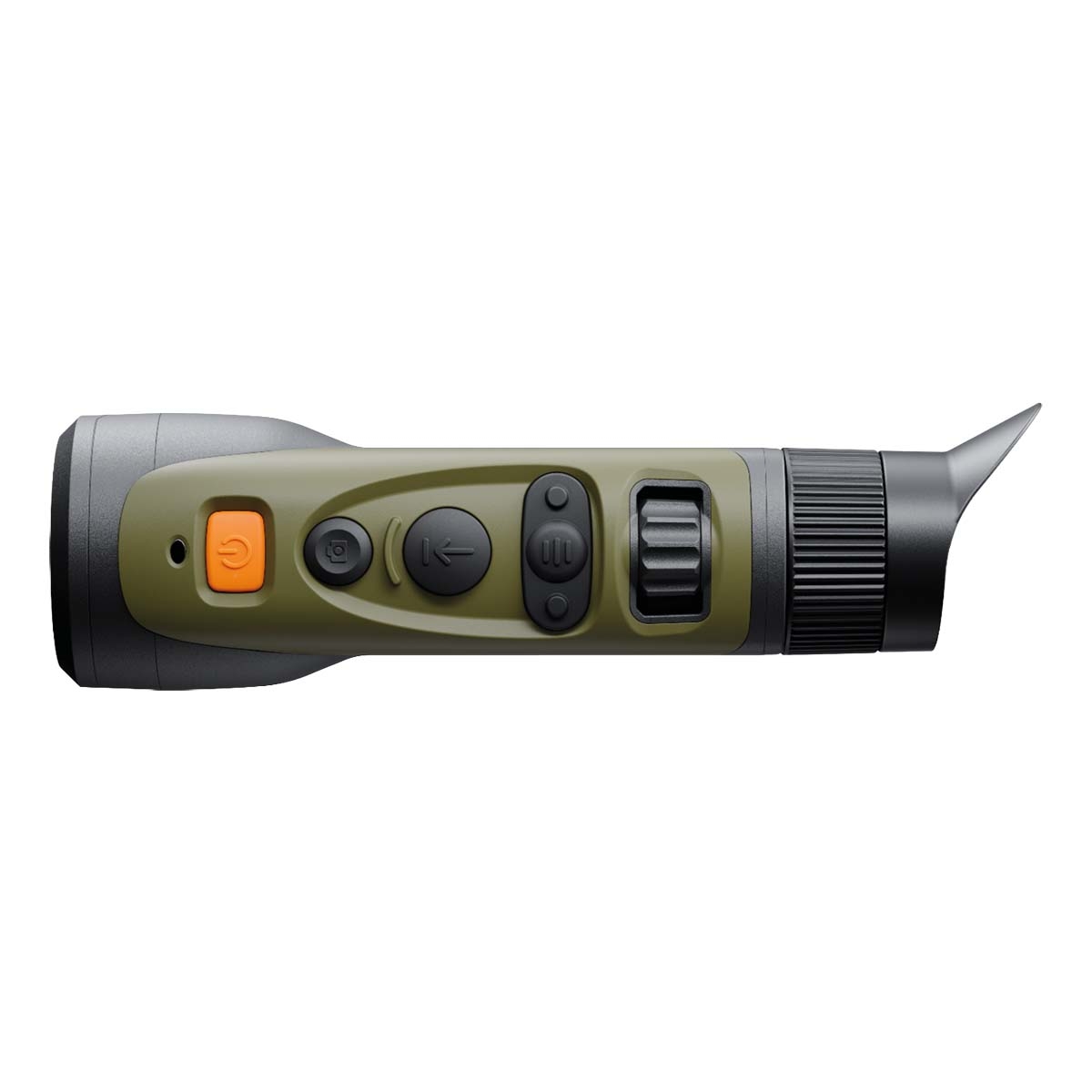 The ergonomics are clearly optimised for one-handed use: the focus wheel is located right in front of the eyepiece, allowing comfortable adjustment with the thumb on either hand. The symmetrical button layout, ambidextrous wrist strap and responsive haptic feedback enhance control and comfort during extended field sessions. At just 179 × 52 × 77 mm in dimensions, it fits well in hand or field pouch.