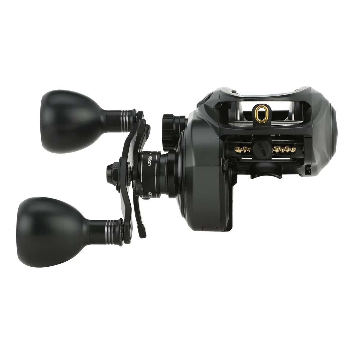 The aluminium frame and handle sideplate provide a rigid platform, while the Oversized Brass Duragear Gen III system is specified to support durability under load. Handling is aided by the A-Symmetric body design and oversized handle knobs, helping maintain control when retrieving heavy lures.