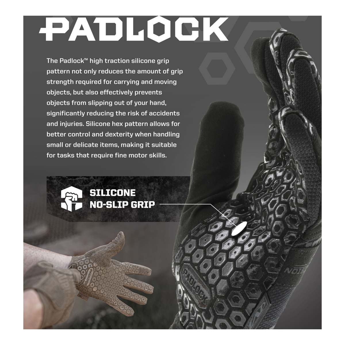 - Padlock™ silicone grip technology on the palm enhances control when gripping equipment.