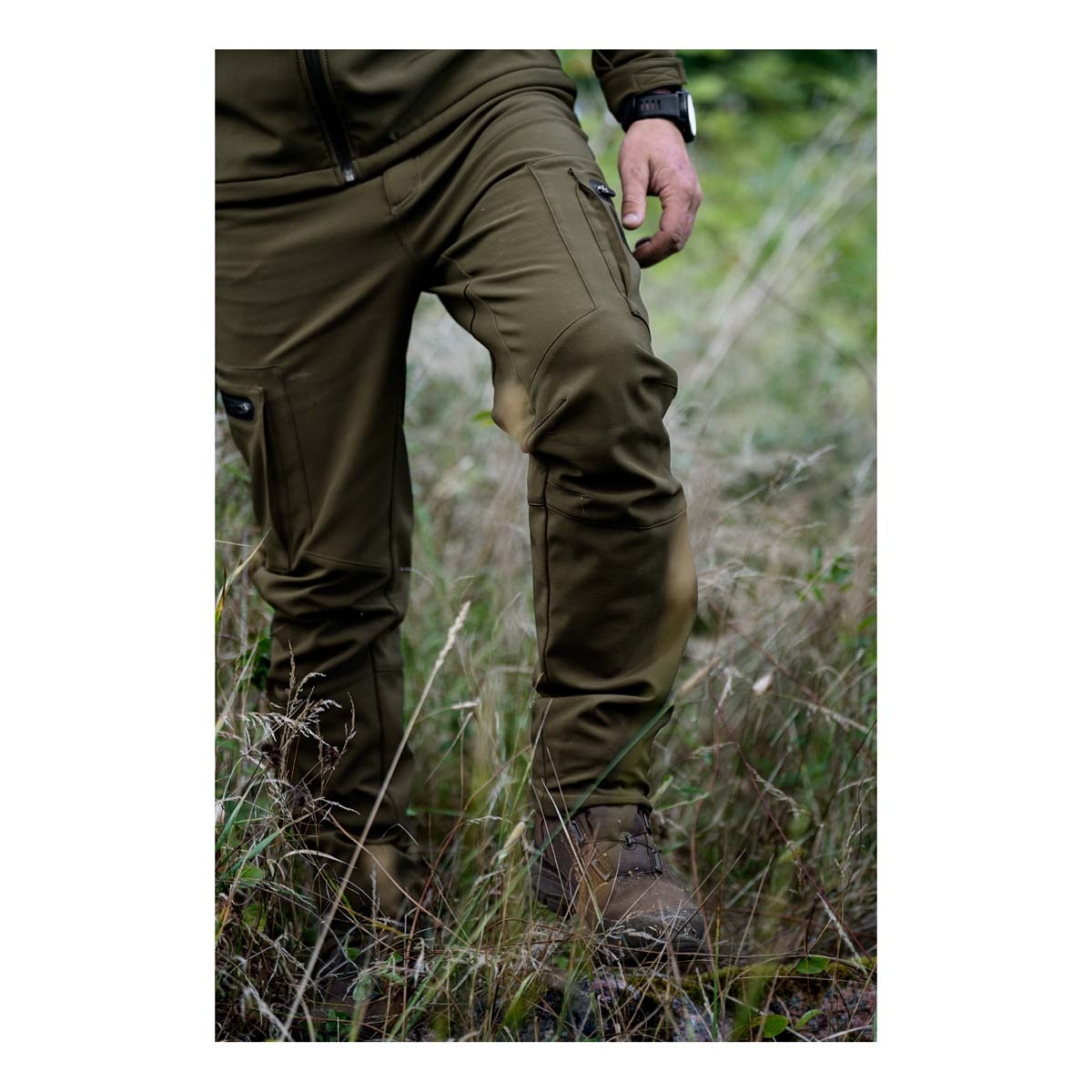 These trousers are crafted from silent ripstop softshell fabric designed to minimise noise while moving through vegetation. The material incorporates a soft fleece backing that enhances comfort and insulation while maintaining flexibility and freedom of movement.