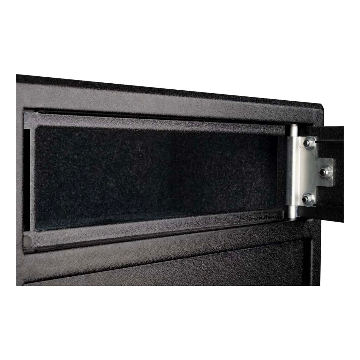 The safe’s reinforced steel body and strengthened door construction create a solid cabinet built to resist tampering. Concealed hinges and a reinforced door edge further strengthen the overall structure, while the anti-drill plate adds protection to the locking mechanism.