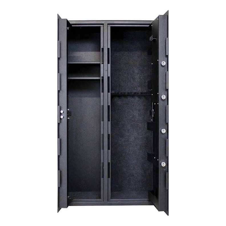 The double-door layout allows convenient access to both firearm and ammunition compartments while maintaining secure separation. Internally carpeted surfaces help protect stored firearms from scratches and impact damage.