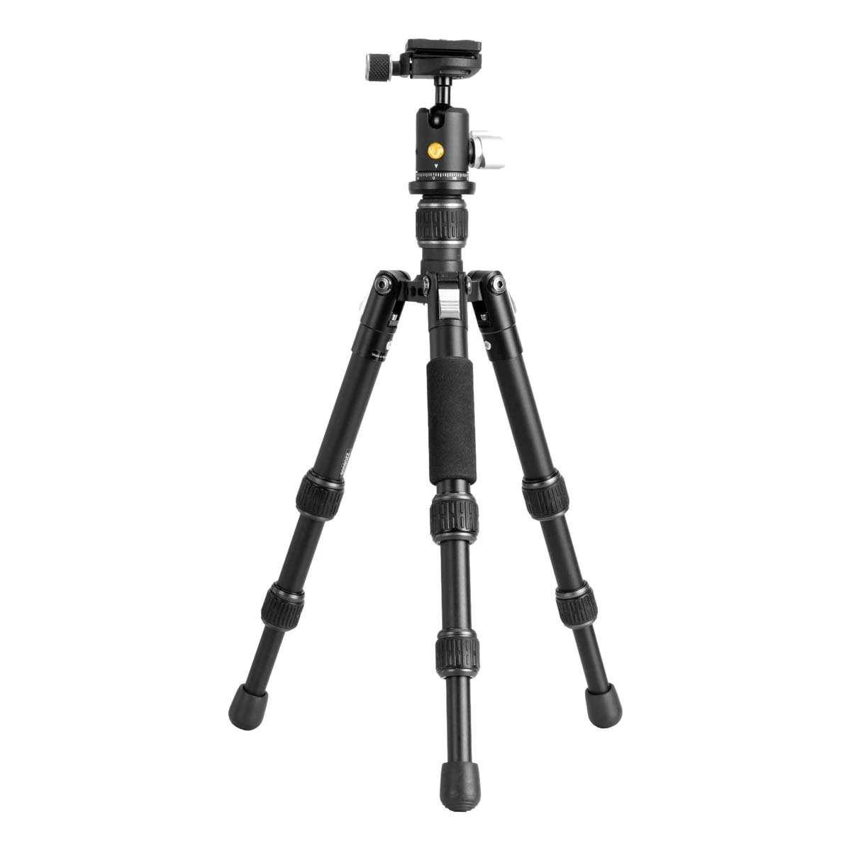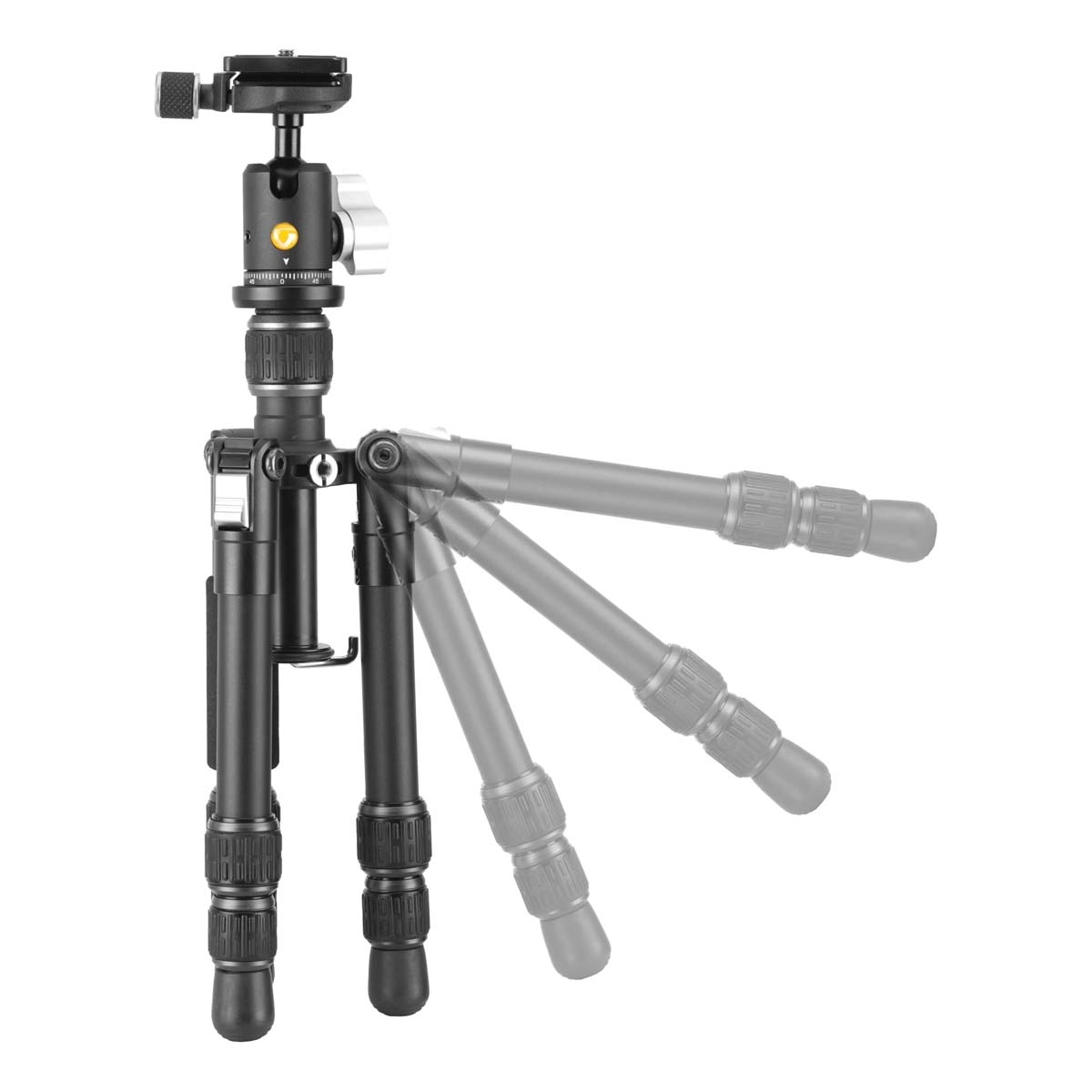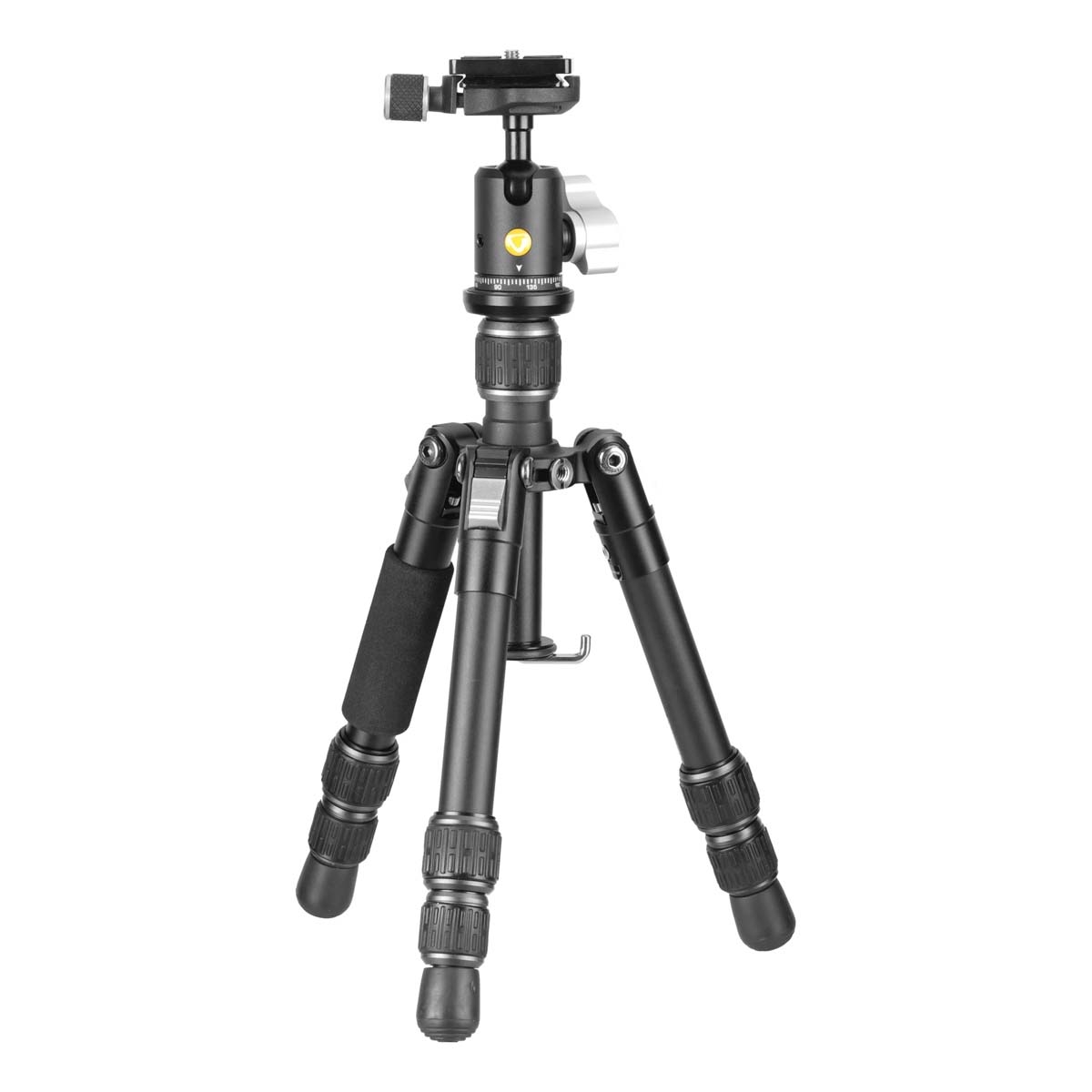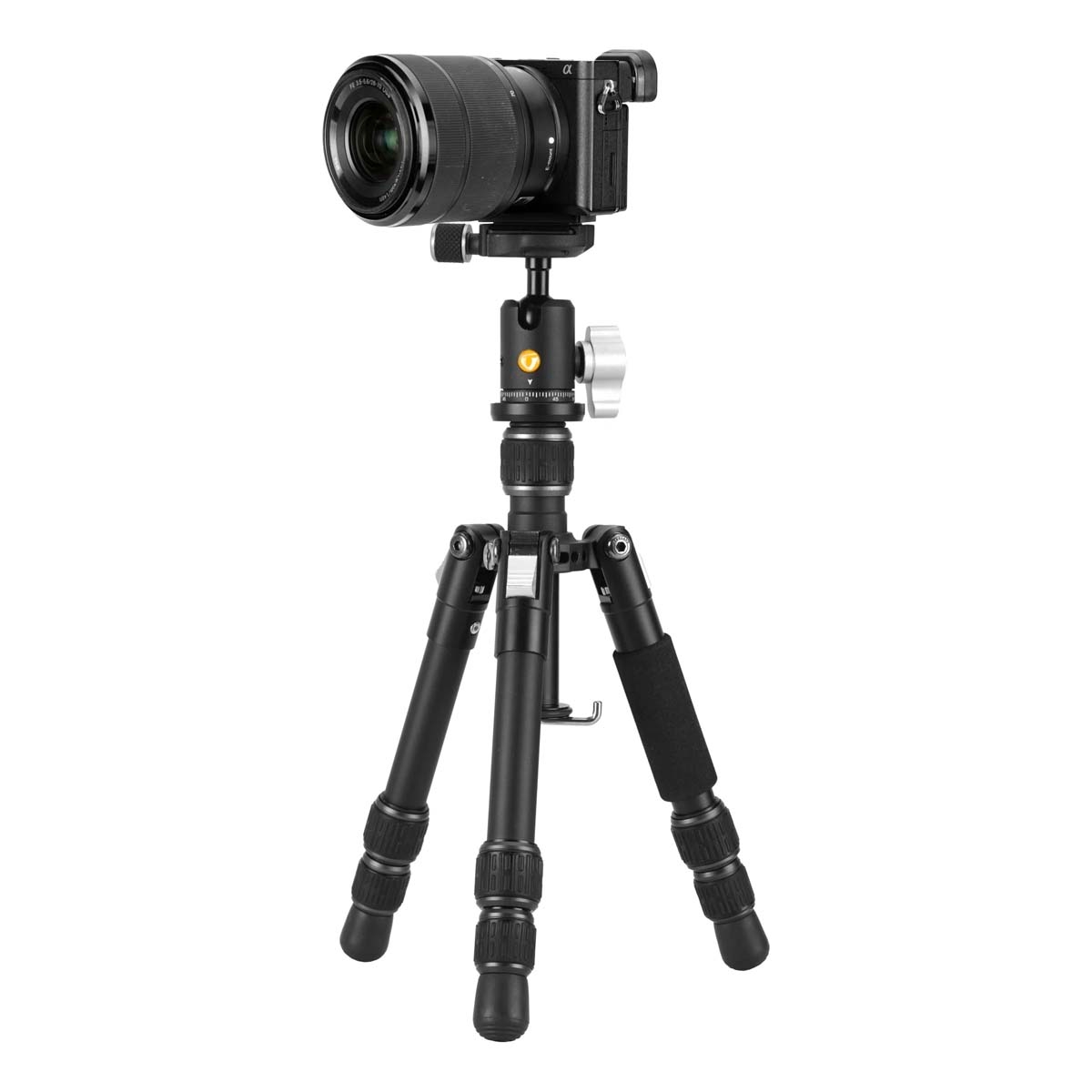 The ball head locking knob offers straightforward control when positioning the camera, while the adjustable leg angles and central column allow quick setup for a variety of shooting perspectives.