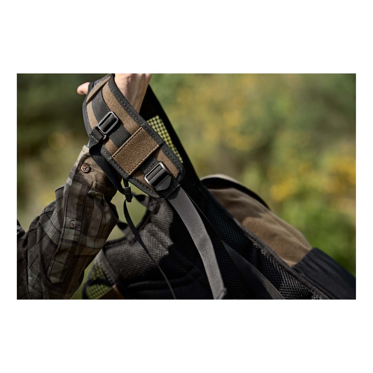 The backpack is fitted with rubber mesh shoulder straps that provide both breathability and grip, helping to maintain stability during active movement. Adjustable webbing chest straps ensure the pack stays securely in place, even when navigating uneven terrain or during dynamic tracking.