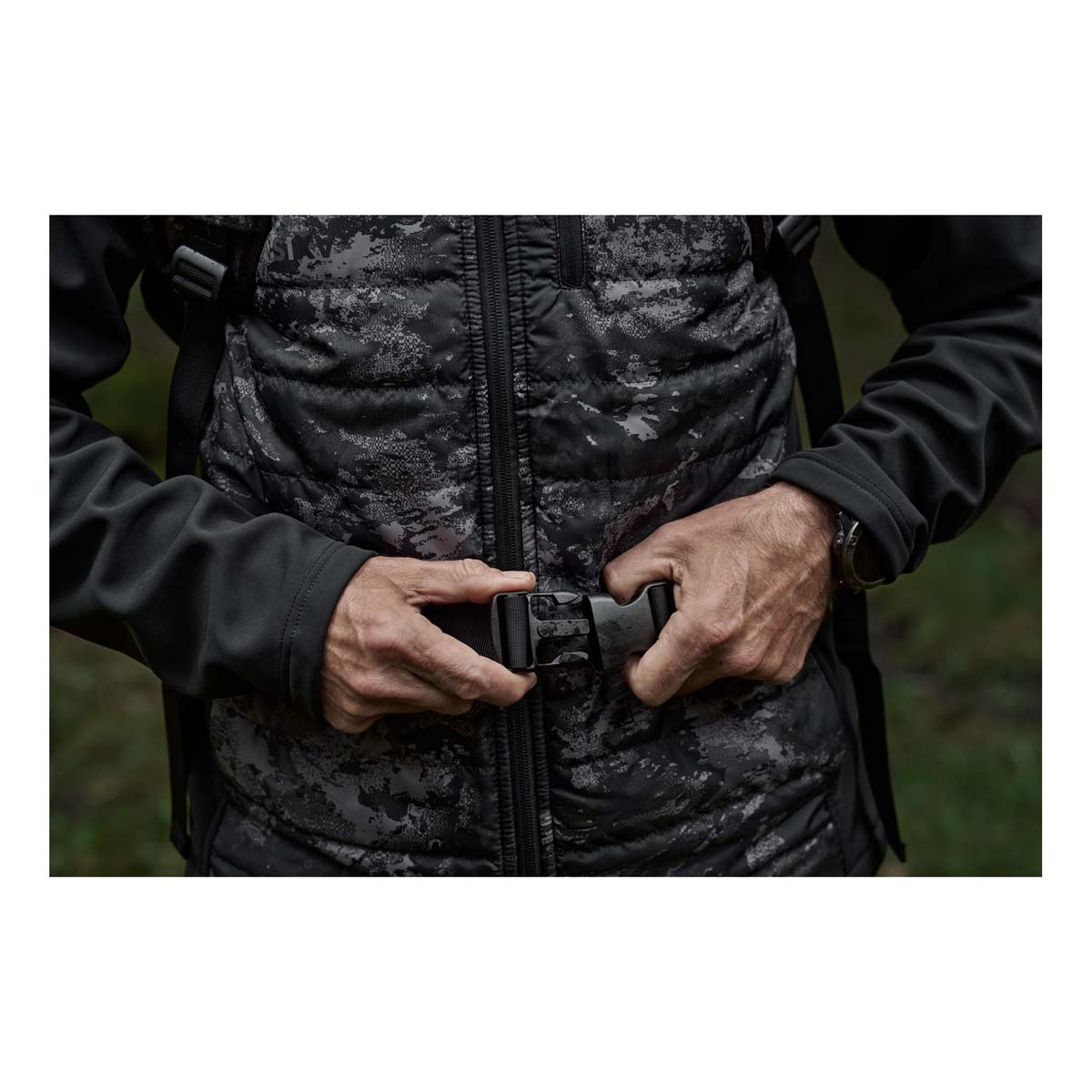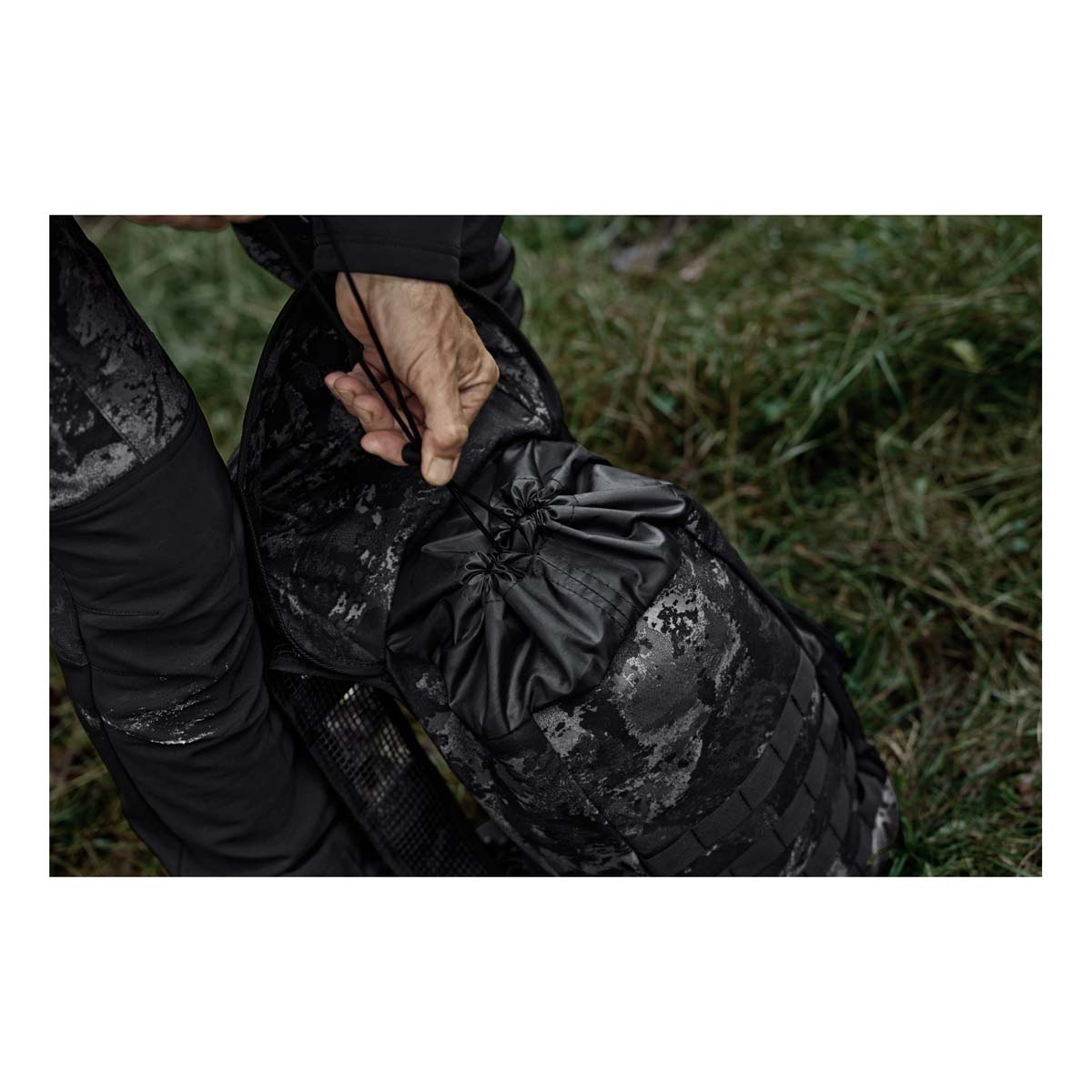 The backpack is constructed from a silent shell fabric designed to minimise noise during movement, making it highly suitable for close-range stalking. The AXIS MSP® Black camouflage pattern enhances concealment in low-light environments, blending effectively with shadows and vegetation.