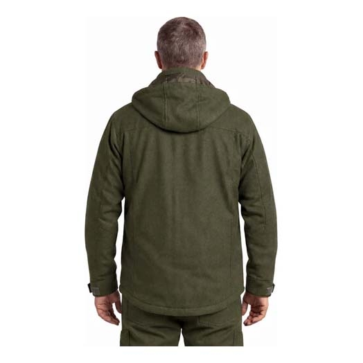 This jacket is constructed from a durable mid-weight silent fabric, designed to minimise noise during movement while maintaining robustness in outdoor environments. The build is reinforced with practical design elements such as a storm flap with concealed stud buttons and branded hardware, ensuring dependable performance in changeable weather.