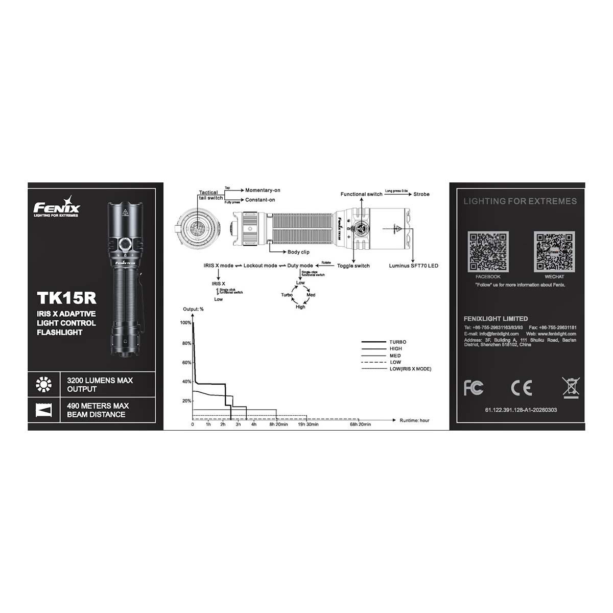 The Fenix TK15R is a high-performance rechargeable tactical torch engineered for police, security professionals, and demanding outdoor users. Designed to deliver both raw power and intelligent illumination, it combines a maximum output of 3200 lumens with advanced Iris-X adaptive lighting technology for seamless operation across changing environments.