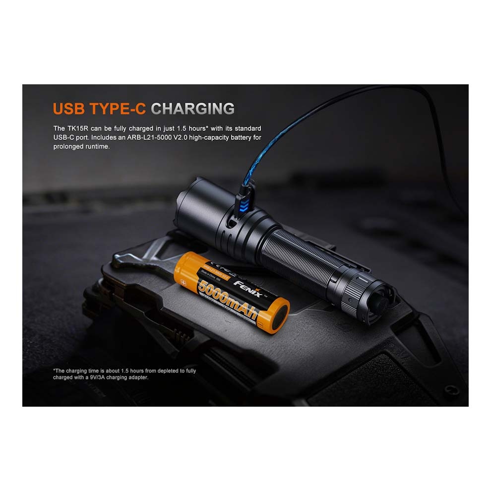 The TK15R features USB-C charging, allowing for convenient and fast recharging. With a suitable adaptor, it can achieve a full charge in around 1.5 hours.