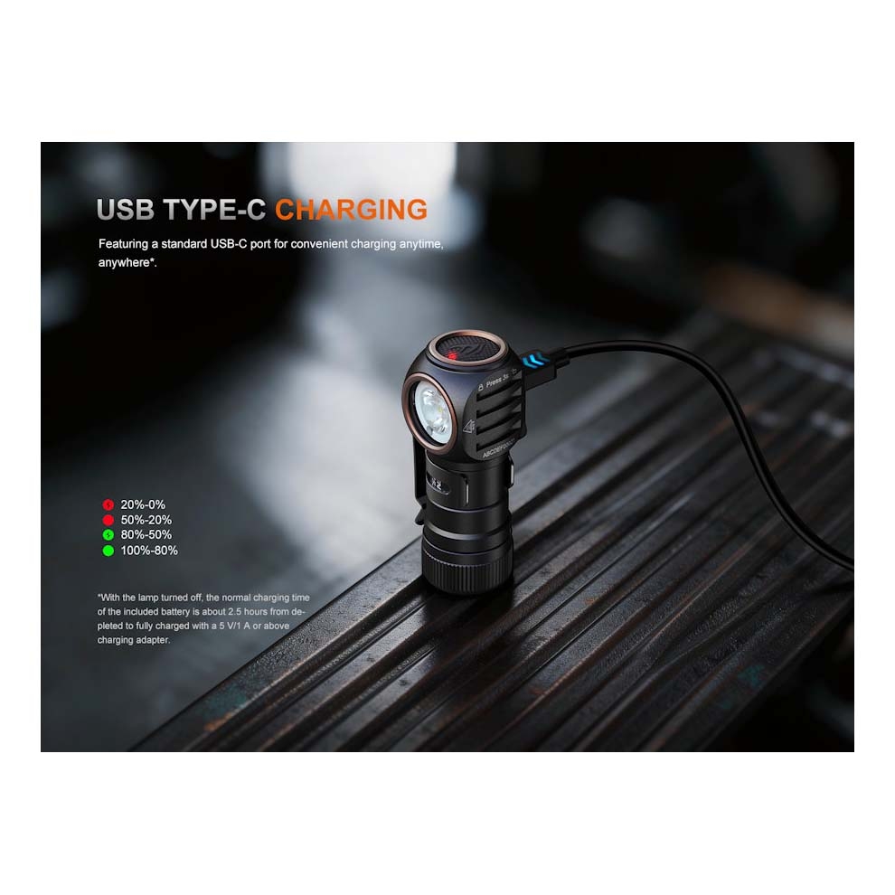 The headlamp is constructed from durable metal with a hard-anodised finish designed to resist wear and abrasion. To maintain performance, keep the charging port clean and ensure the anti-dust cover is securely replaced after charging. Store the unit dry when not in use.
