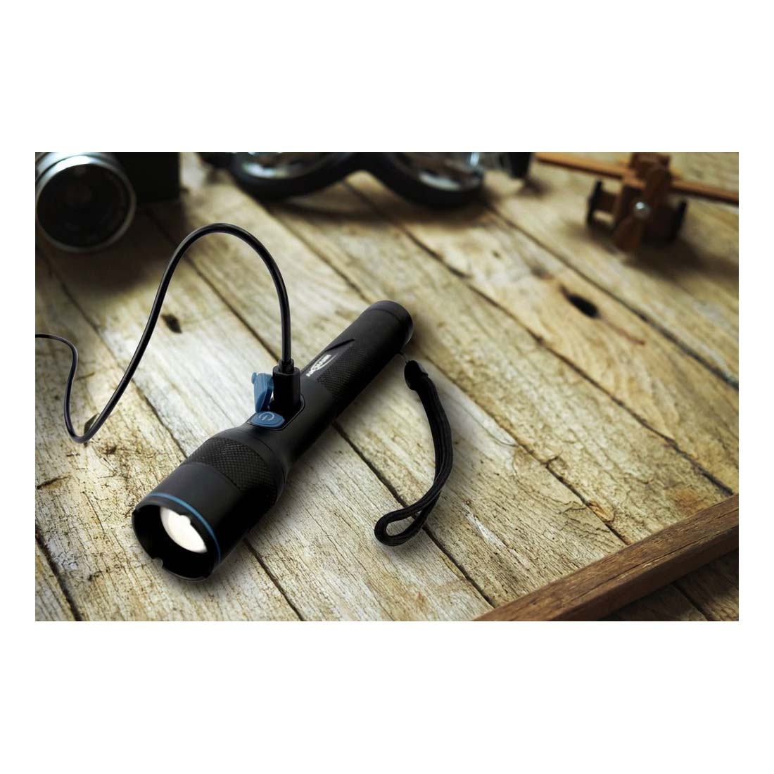 The torch includes a wrist strap, rechargeable Li-ion battery and operating instructions for immediate use.