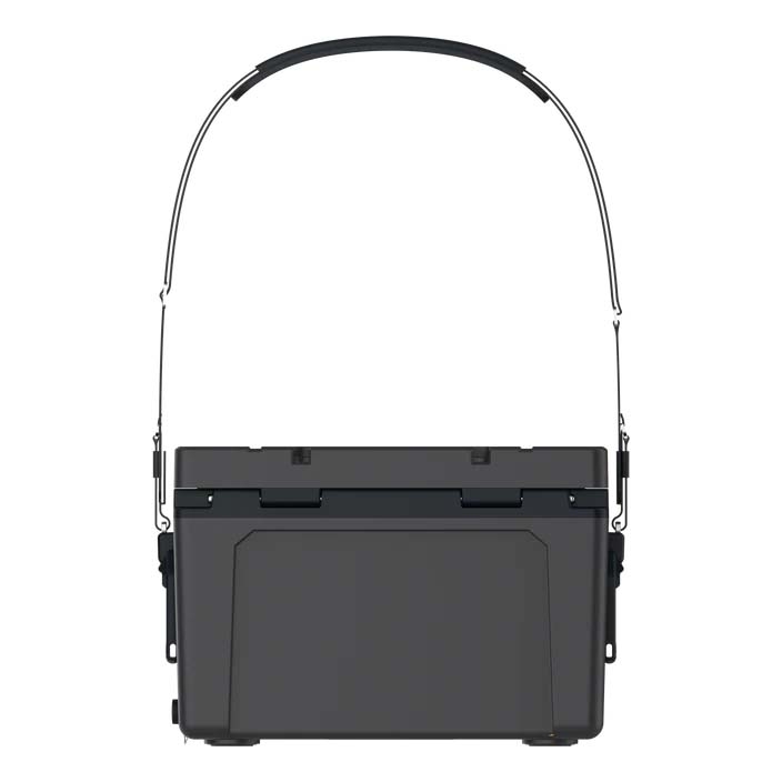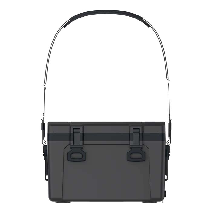 The cooler is designed for practical, ergonomic carrying. A padded, removable shoulder strap enables hands-free transport, while integrated side handles provide additional carrying options when loading or moving heavier contents.