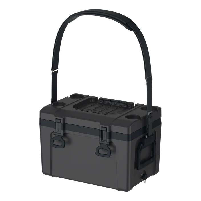 The cooler can be carried using the padded shoulder strap or the integrated side handles, offering flexibility depending on load and preference.